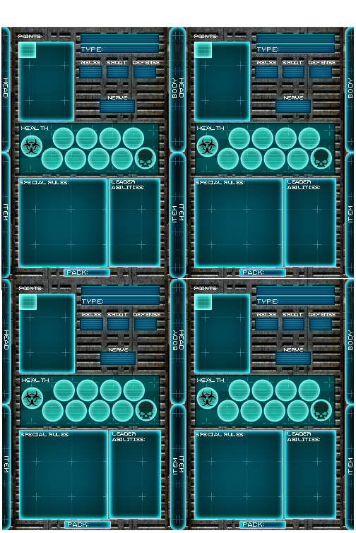 You’ll need to make your own character cards – I used the free ones from Mantic as a template to create some sci fi styles ones. I am sure there many of you out there who are vastly better at graphic design and have more than a free copy of CS2 to design them on!!! But for those of you who can use them – feel free to use these, you can cut and stick images over the window top left used to stick the character image.