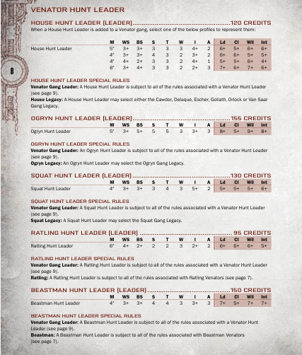 These are; House Hunt Leader, Ogryn Hunt Leader, Squat Hunt Leader, Ratling Hunt Leader and Beastman Hunt Leader. The House Leader has essentially just taken the various profiles and incorporated the house legacy rules into it. The others though, are unique to their race.